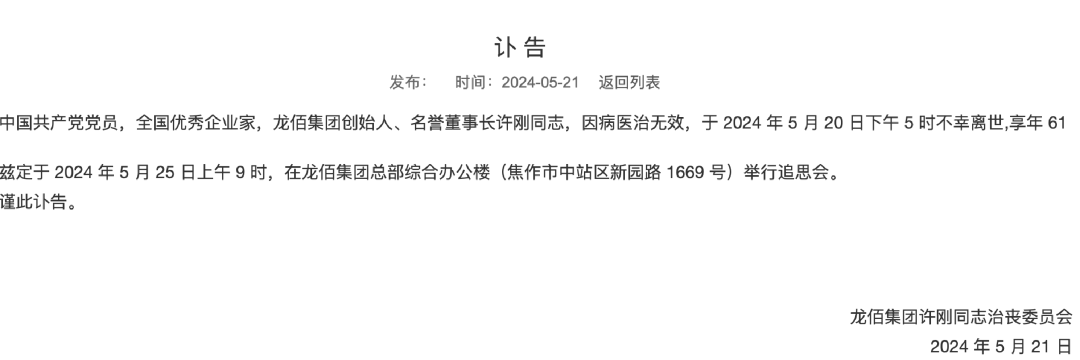5月21日,龙佰集团、东方锆业同步发布公告称,收到公司控股股东、实际控制人许刚家属通知,许刚于2024年5月20日因病医治无效不幸离世,享年61岁。